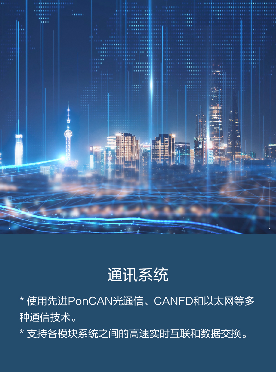 * 使用先进PonCAN光通信、CANFD和以太网等多种通信技术。